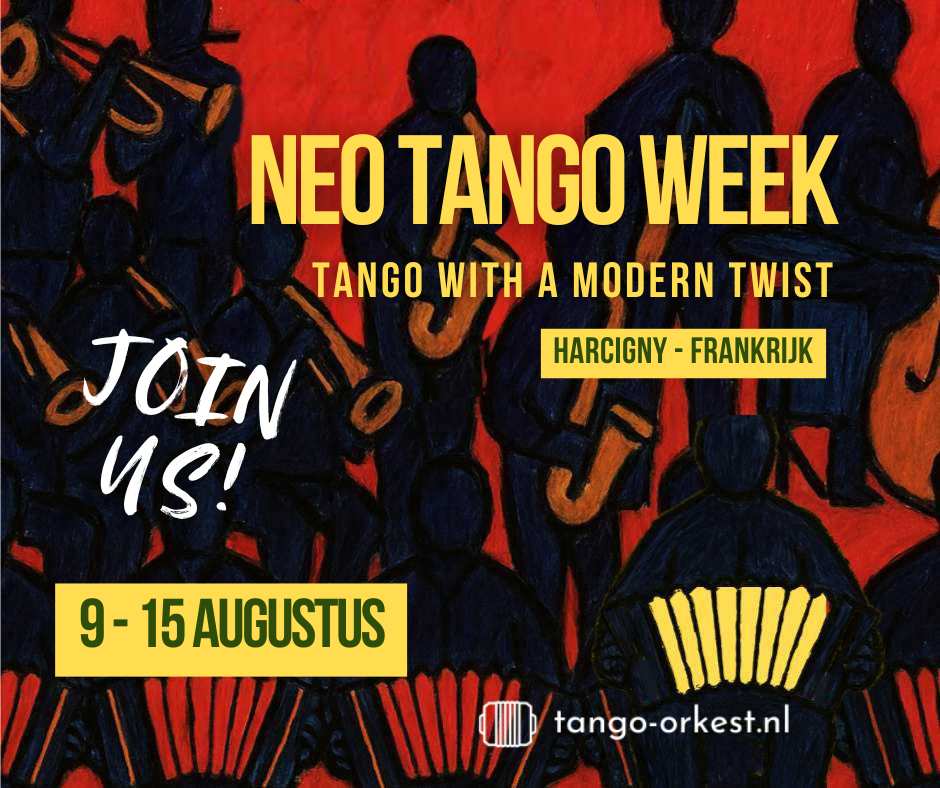 De Neo Tango Week is een primeur en is ontstaan vanuit het idee om, naast de traditionele instrumenten in een tango-orkest, ook te werken met een bigband-setting. Neo tango, een moderne variant van de traditionele Argentijnse tango, combineert elementen van tango met invloeden uit andere genres zoals jazz, pop, rock, elektronica en klassiek. Het is een experimentele stijl die nieuwe harmonieën, ritmes en instrumentaties verkent, en we zullen tijdens deze week volop de veelzijdigheid van tango ontdekken.